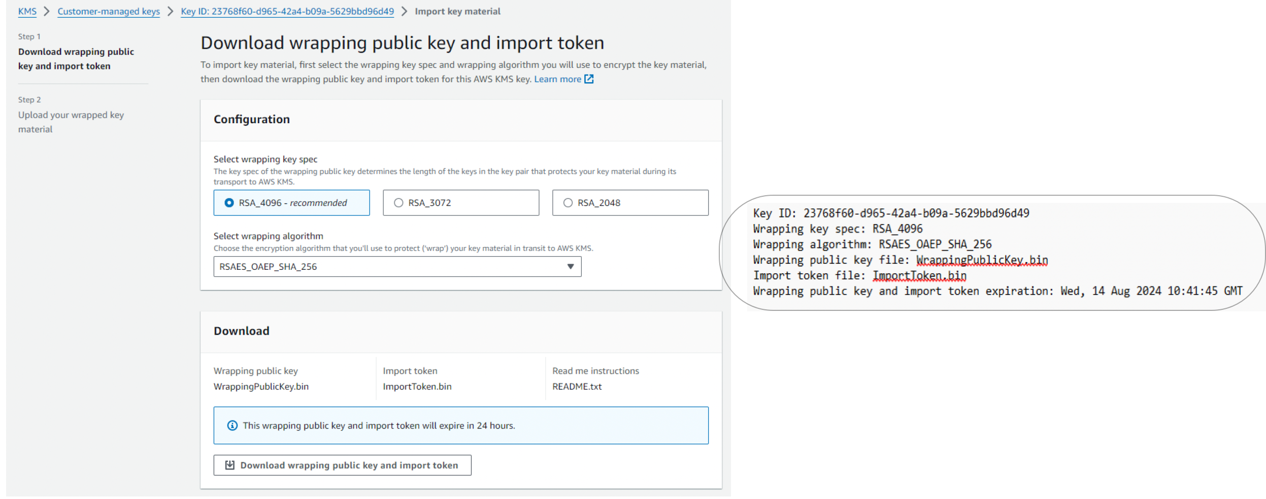 Once the KMS key is created, we can download the Import Key material, which will include three