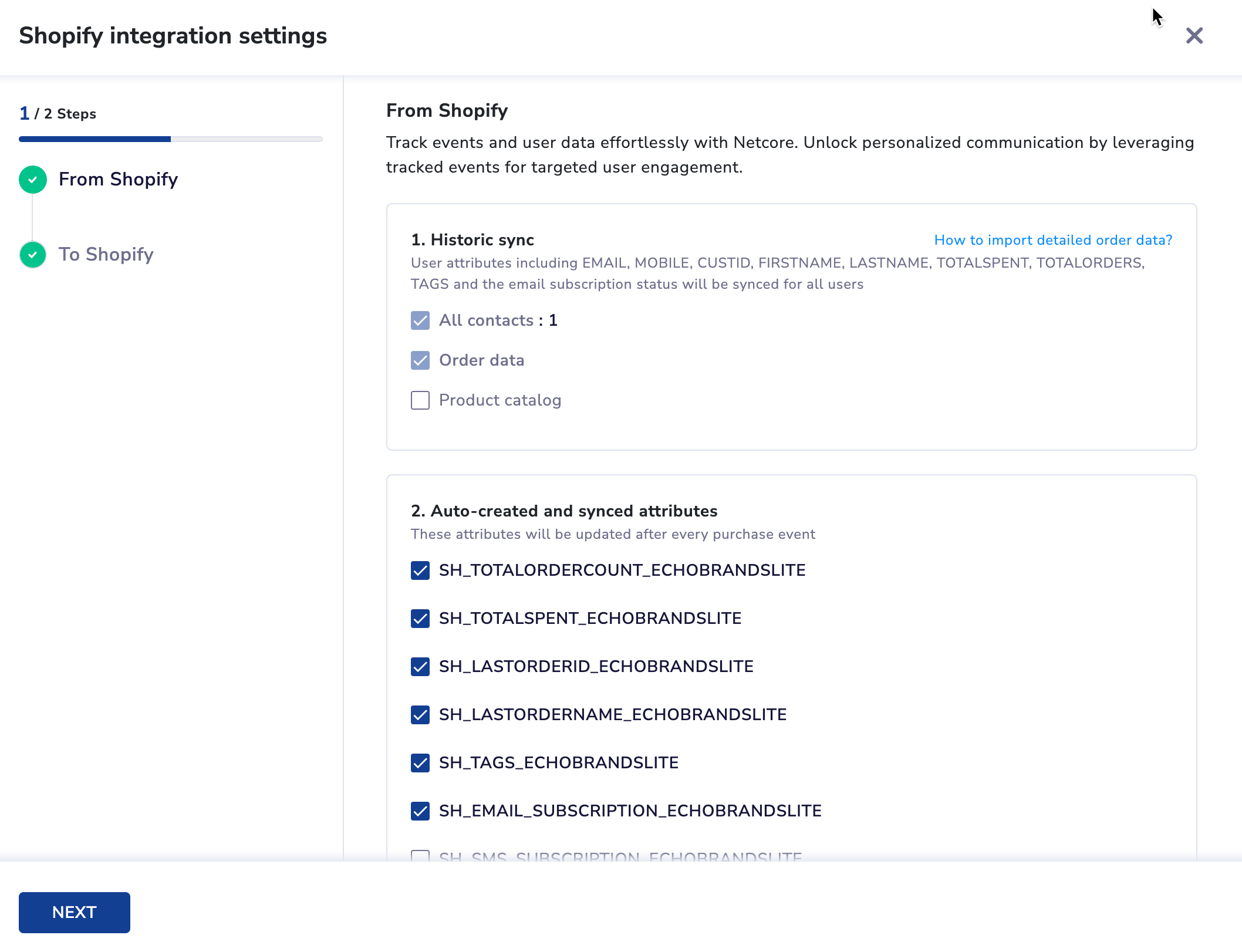 The From Shopify section allows you to pull data from Shopify into Netcore CE. This includes syncing customer contacts, historical orders, attributes, and events.