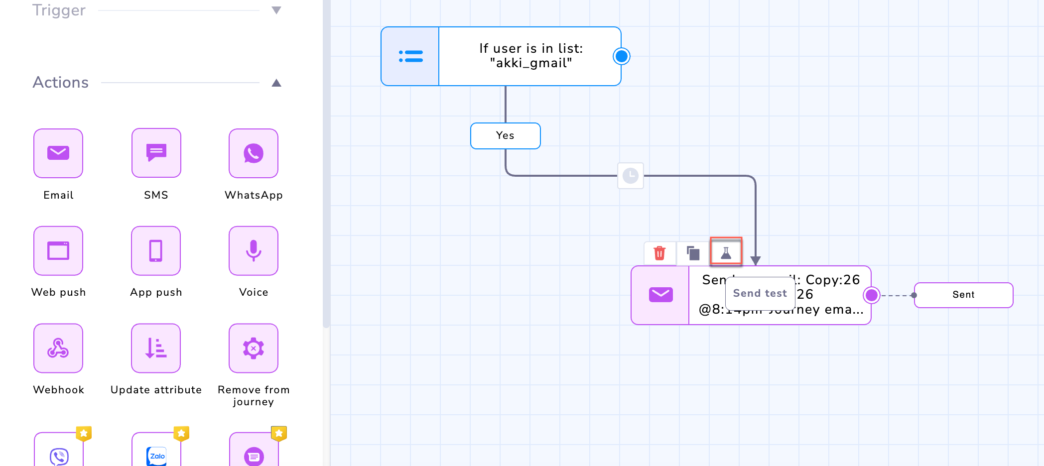 - You can send test emails directly from the Action node on the Journey canvas: